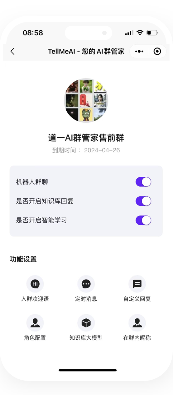 Tell Me AI(群管家)是一个群运营AI数字人,帮助“群主、运营人员、销售人员”等进行微信群运营,智能生成群内容引起用户兴趣、智能回复群用户问题、激发用户活跃、引导用户留资(电话等)、识别潜在付费客户,最终完成用户付费转化。